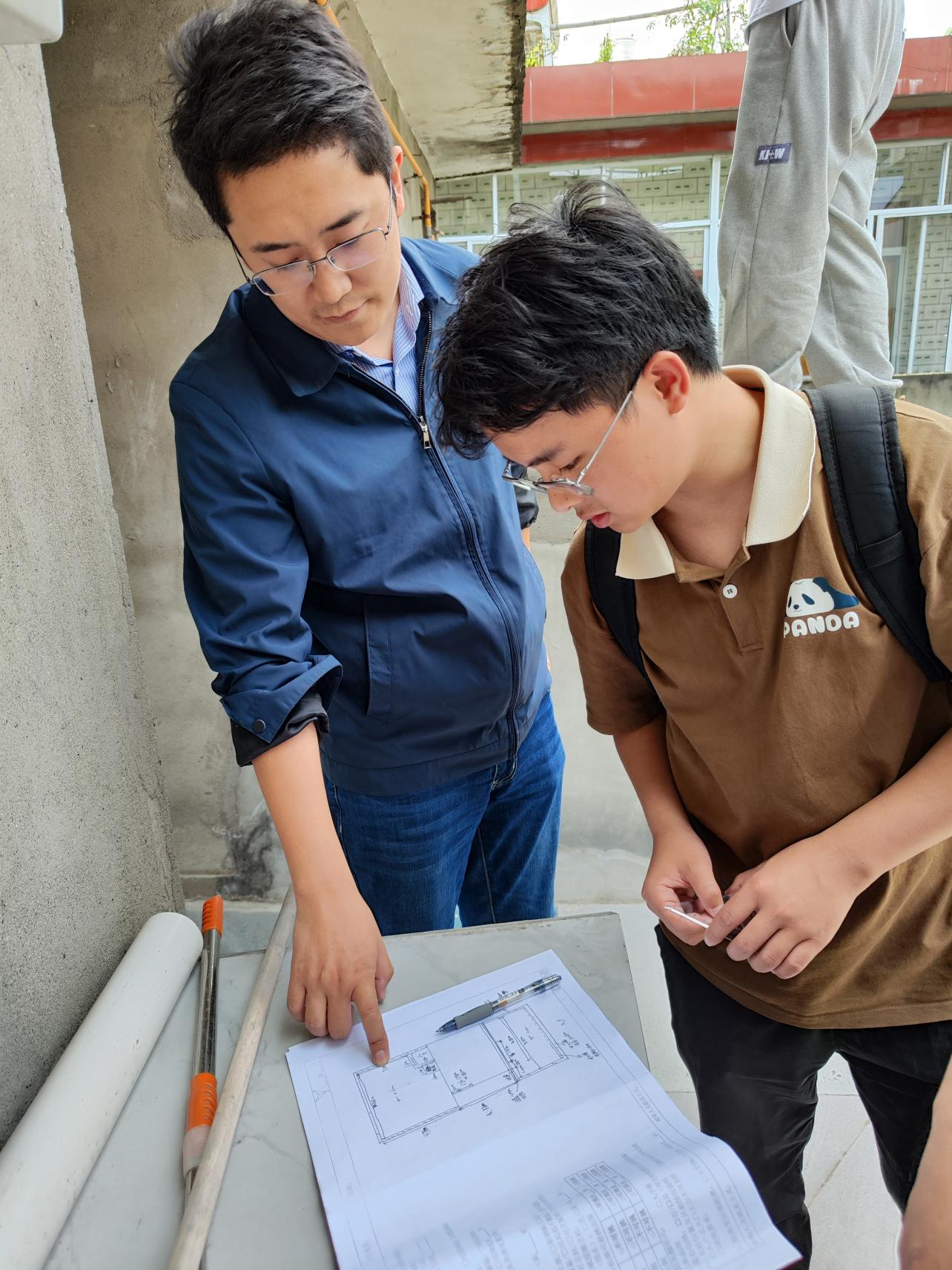 图为总经理助理兼综合能源部经理赵科(左)在指导员工进行房屋平面草图绘制。