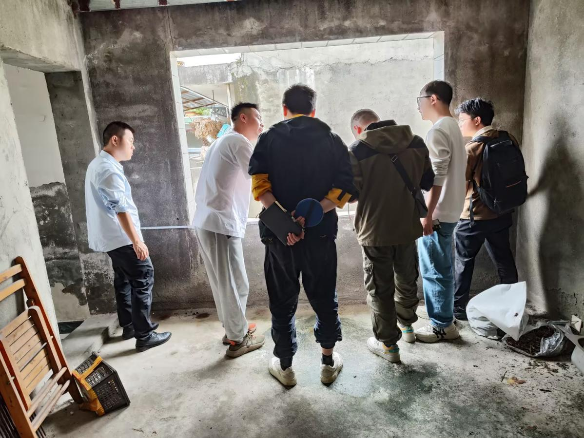 图为光伏设计陈宏(左二)在指导其余员工进行房屋结构数据测量。